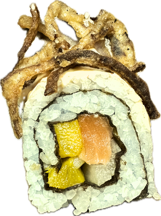 Salmón ahumado, mango, cohombro con topping de cebolla crispy y salsa dinamita