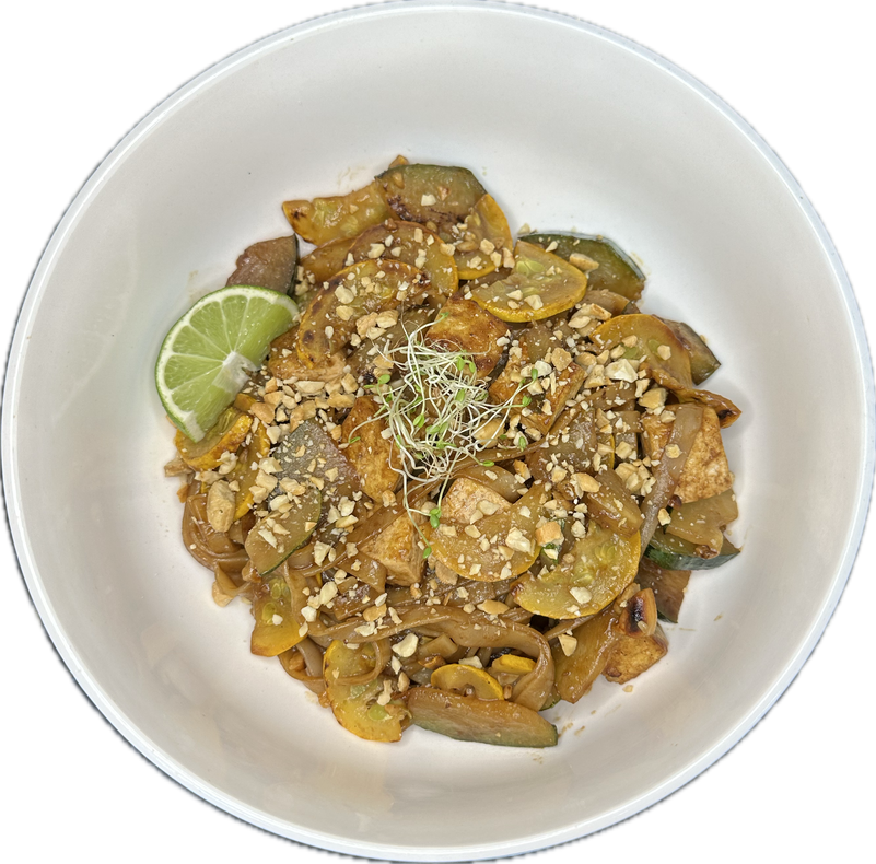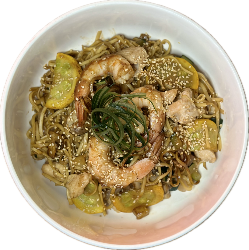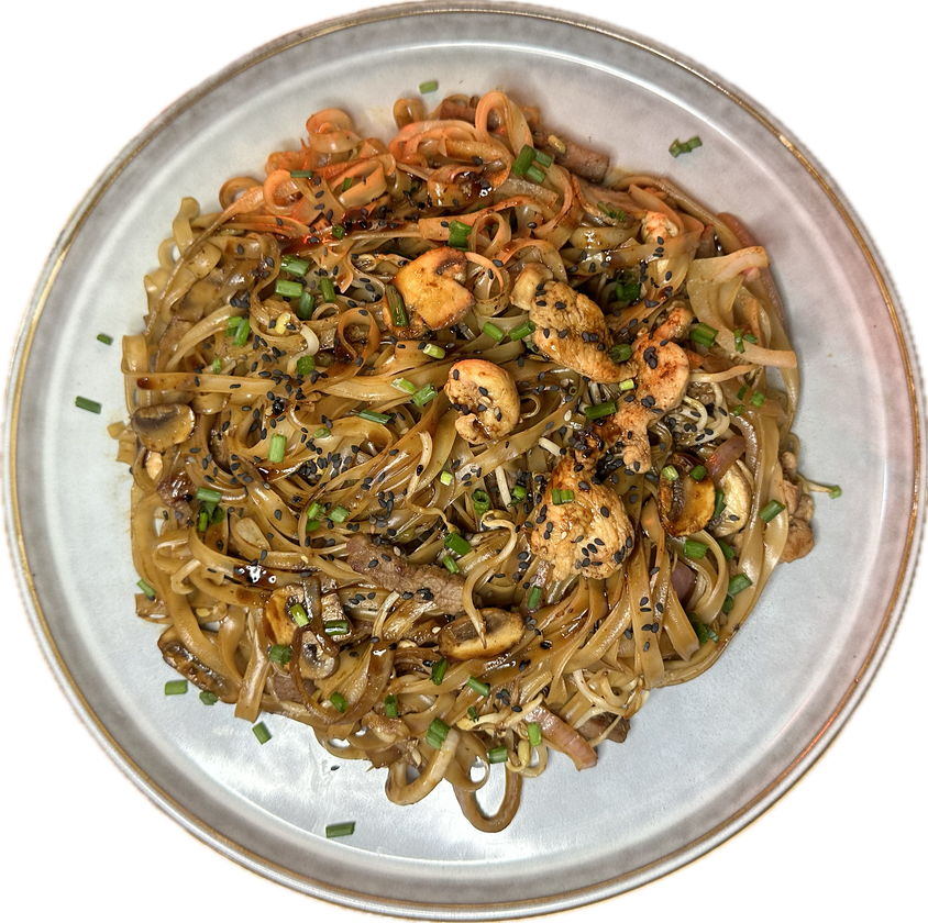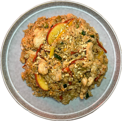 Arroz al wok con pollo salteado, pimentón, manzana, ajonjolí, zuchinni y nam-pla