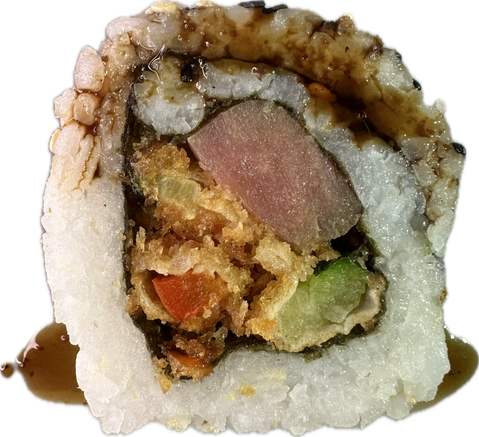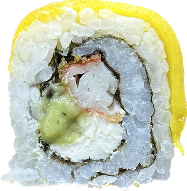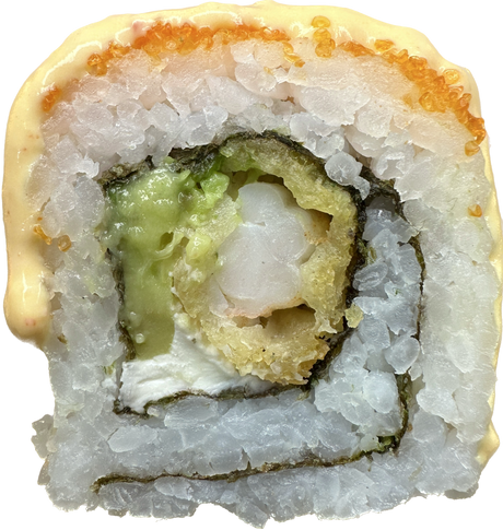 Langostino tempura, queso Philadelphia, aguacate con topping de masago y salsa dinamita