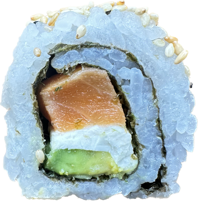 Salmón, aguacate, queso Philadelphia y topping de sesamo negro