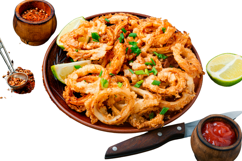 Frutos del mar apanados, mejillones, maíz, pimentón, raíces, zanahoria y cebollín, coronado con cebollas crocantes