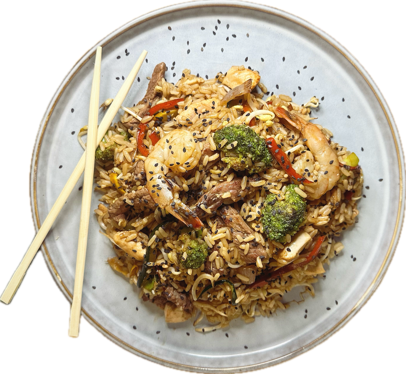 Arroz al wok con lomo de res, pollo y langostinos salteados en salsa teriyaki, aceite de sésamo, raíces, cebolla, brócoli, zuchinni, pimentón y huevo