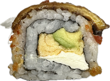 Queso crema, aguacate y tamago (tortilla de huevo) en su interior, con topping de plátano y salsa agridulce dragon